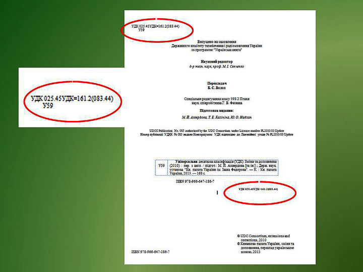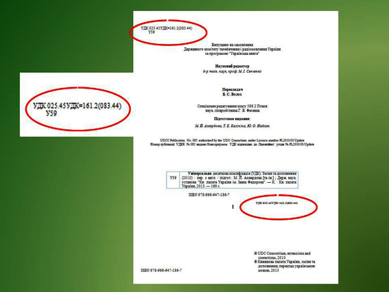 Визначення індексів УДК, авторського знака для документів Загальні відомості Відповідно до Державного стандарту України (ДСТУ 4861:2007 "Інформація та документація. Видання. Вихідні відомості") вихідні відомості кожного видання повинні містити шифр зберігання видання. Шифр зберігання складається з класифікаційних індексів Універсальної десяткової класифікації (УДК) та авторського знака. Один і той самий шифр зберігання проставляється на весь тираж одного видання. Шифр зберігання розміщується у верхньому лівому куті звороту титульного аркуша видання у такій послідовності: Авторський знак подають під першою цифрою індексу УДК. Складові шифру визначаються за відповідними таблицями: